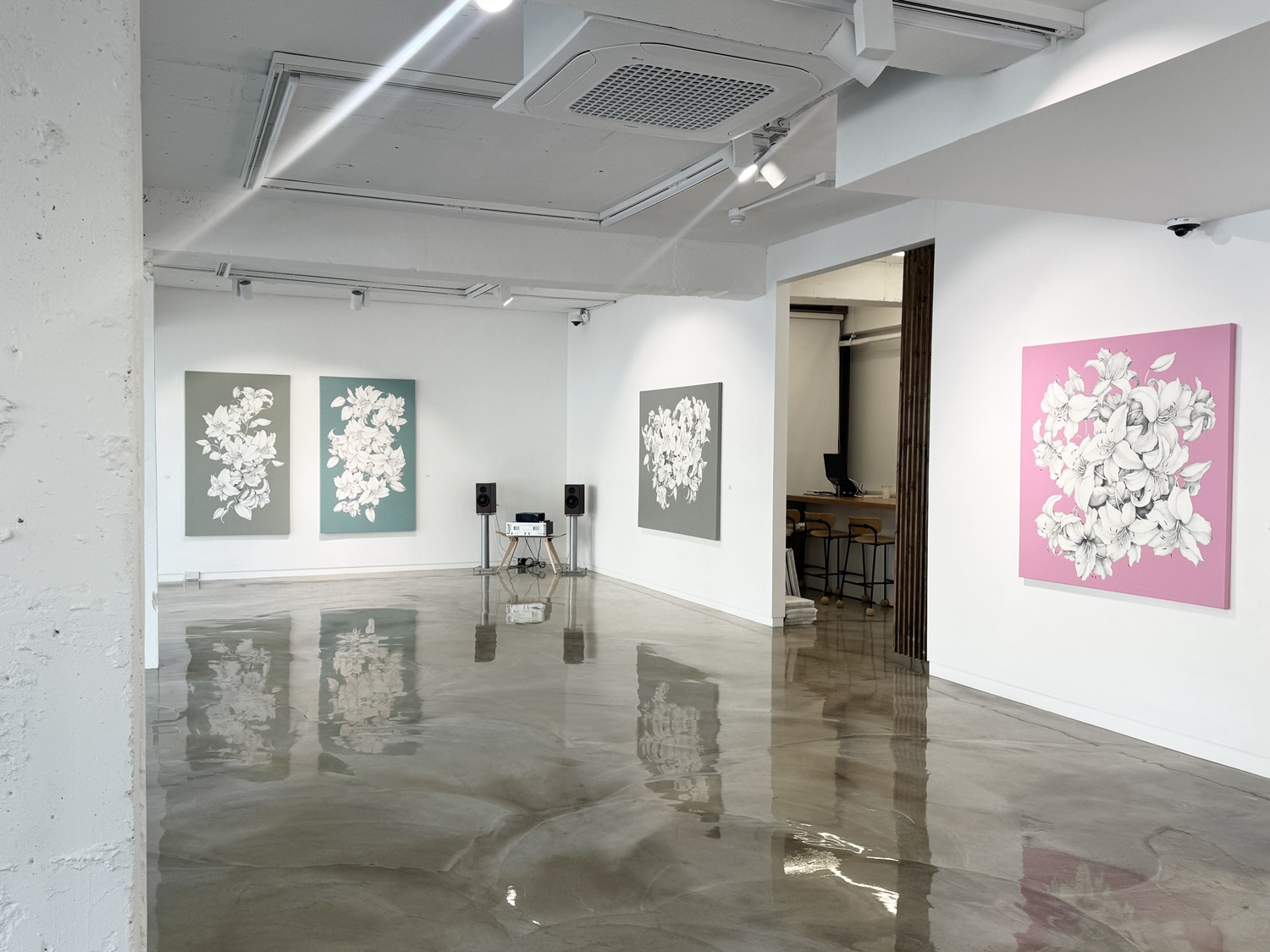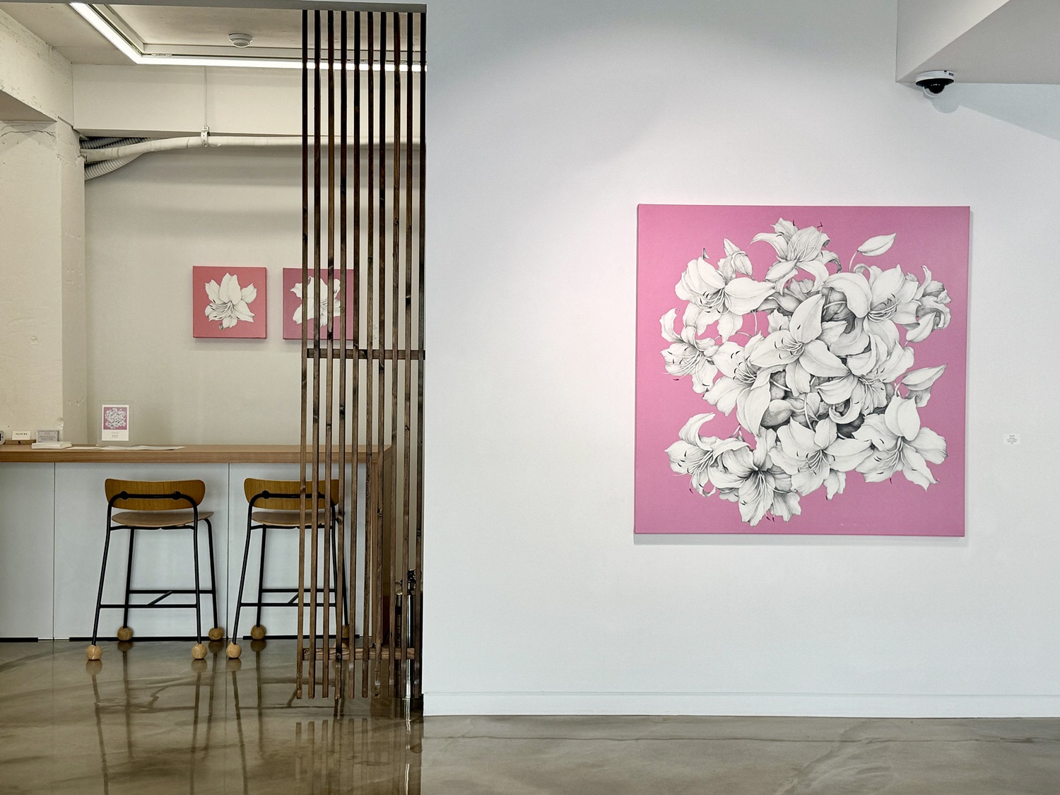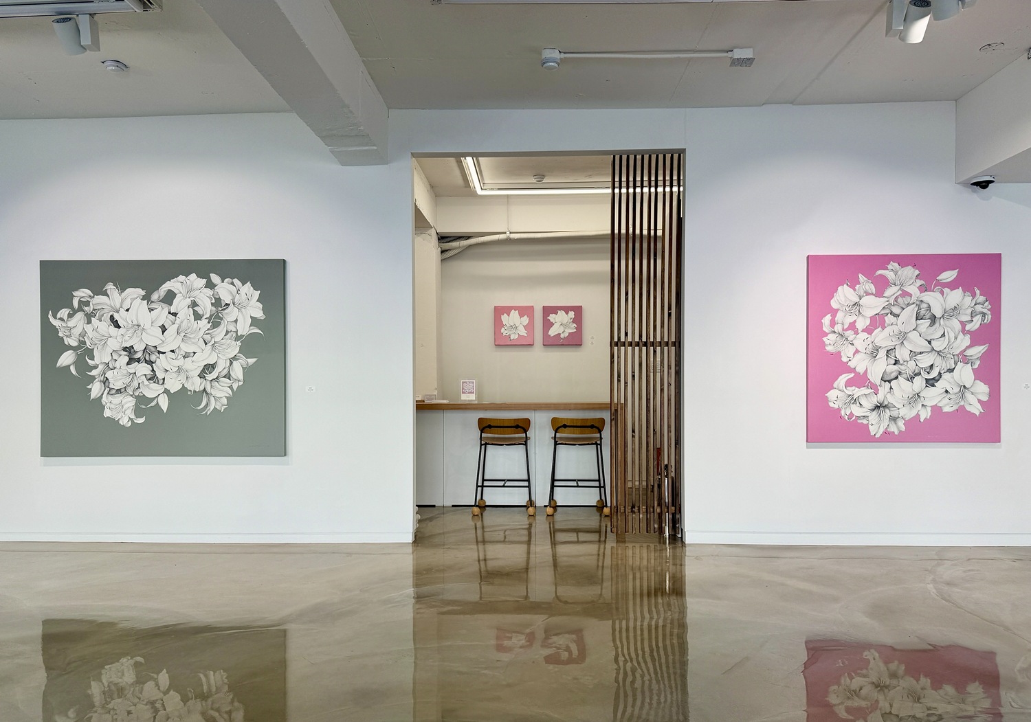 단색조의 세밀한 꽃과 채도가 높고 평면적인 배경이 빚어내는 강렬한 대비는 화면 안에 기묘한 시각적 긴장감을 형성한다. 차분한 그레이 블루, 옅은 보라, 그리고 선명한 핑크빛 공간 속에서 무채색의 꽃들은 배경으로부터 떠오르는 것인지 심연 속으로 스러져가는 것인지 알 수 없는 모호한 경계에 놓여 있다. 형상은 특정한 공간을 물리적으로 점유하지 않고 허공을 부유하며 삶과 죽음이라는 경계를 허문다. 작가는 이 화면을 통해 이 형상이 생의 가장 아름다운 순간인 화양연화(花樣年華)인지, 아니면 소멸을 앞둔 직전의 찰나인지 조용히 질문을 던진다.